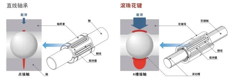 與直線軸承不同,滾珠花鍵具有滾動槽。滾動槽具有與鋼球類似的R形,因此可大幅度增加承載的載荷,實現高承載能力及長使用壽命。與直線軸承相比,其容許載荷為直線軸承的13倍,壽命約為直線軸承的2200倍。