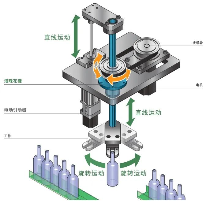 滾珠花鍵通過單軸傳遞扭矩,因此可實現直線及旋轉的組合運動。